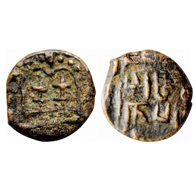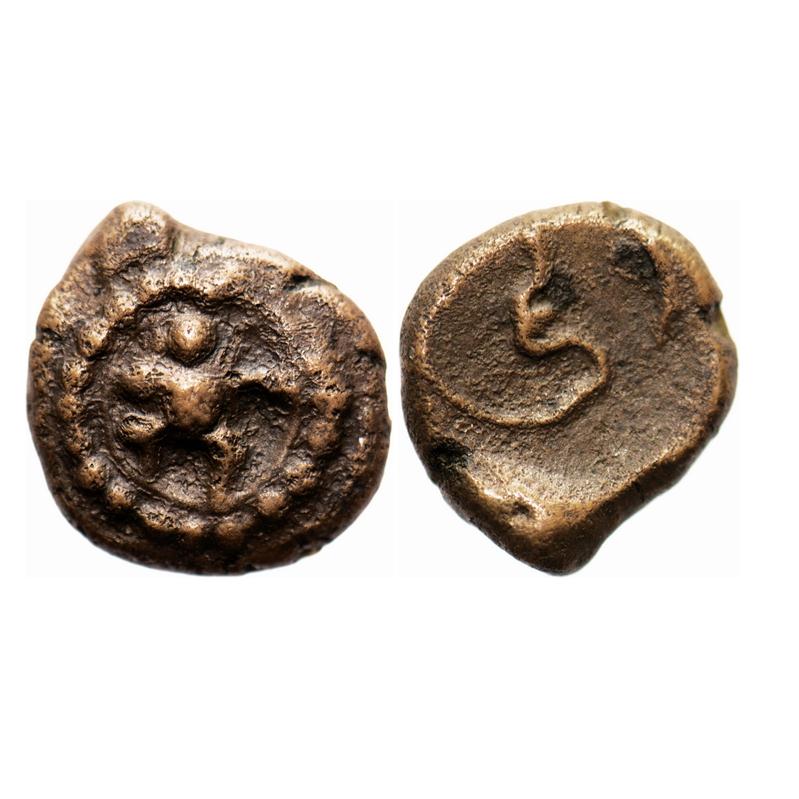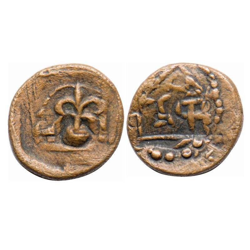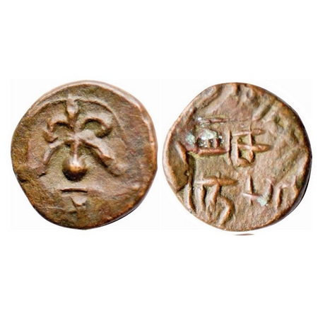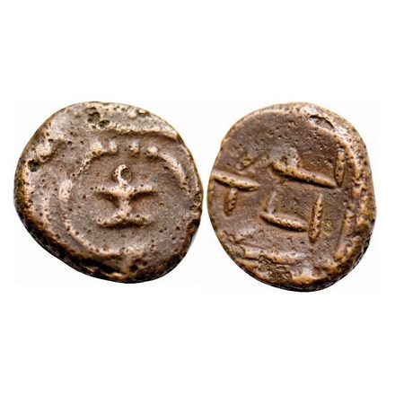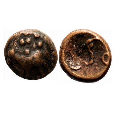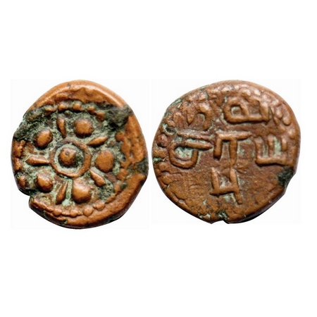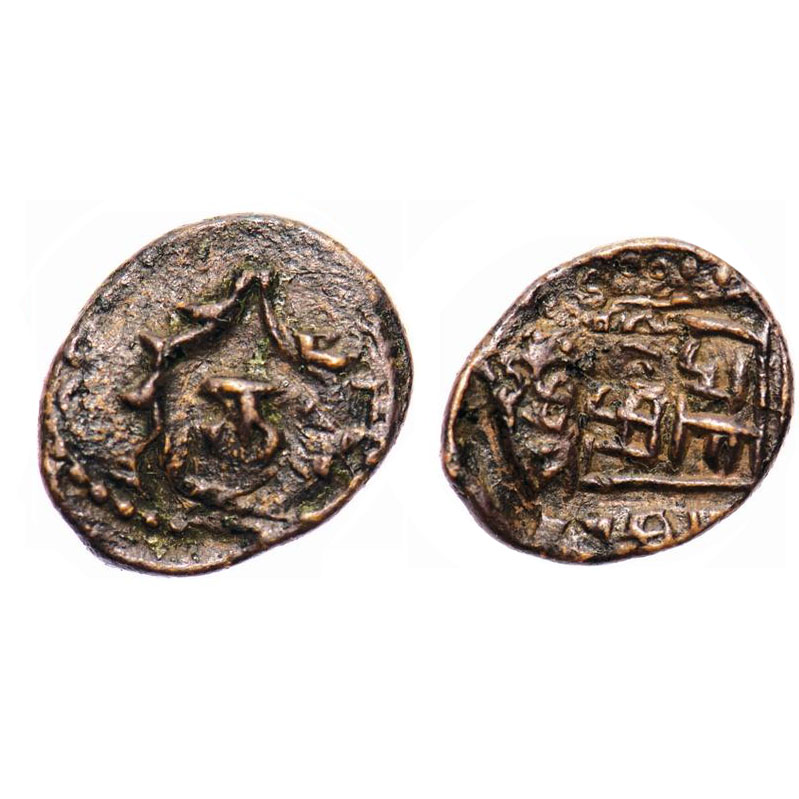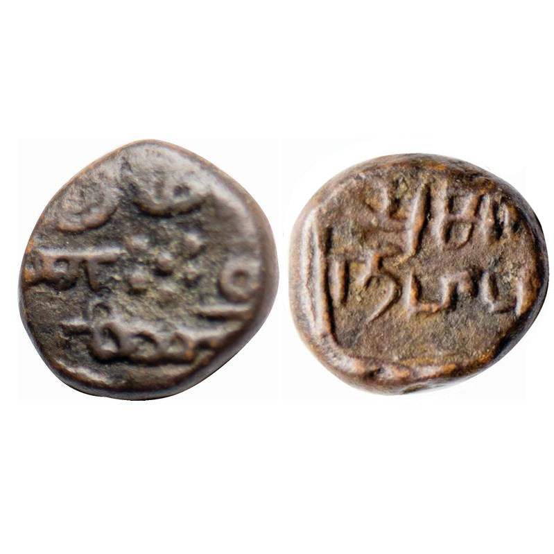 Arcot Nawabs, Copper Unit, 1.44g, Early Madurai issue, Obv: Two shivlingams with in Decorated Border. Rev: Asunaba in tamil in reverse.a n exceptional coin and believed to be unique till date. Very Fine+, Very Rare.