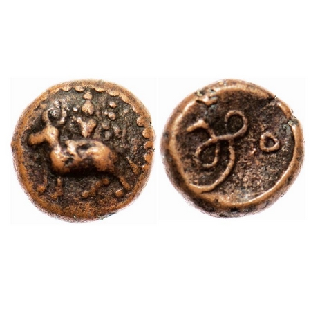 Arcot Nawabs, Copper Cash, 2.98g, Early Issue, Obv: Dancing figure, Rev: Tamil Grantha 'Sri'. KM Unlisted. Very Fine, Rare.