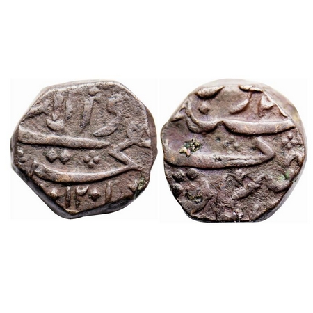 Arcot Nawabs, Copper Fractional Unit, 1.36g, Early Issue, Obv: Persian legend Walajah, sanah 1201, Rev: Flag pole to left divides sun and moon besides. Very Fine, Scarce.
