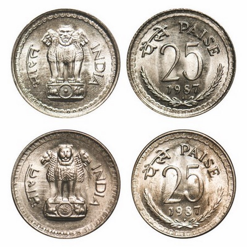 25 Paise, Cu-Ni, 2.51g (2 Coins), 1987. Bombay Mint, Two different dies types in Small and big lion. Uncirculated. Scarce.