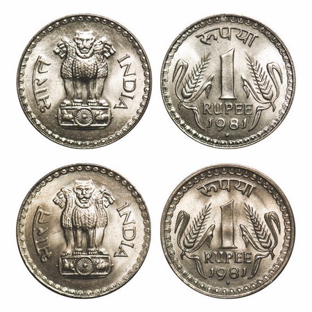 1 Rupee, Cu-Ni, 8.00g (2 Coins), 1981. Bombay Mint, Two different dies Security and milled edge. Uncirculated. Rare.