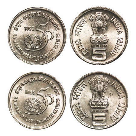 5 Rupees, Cu-Ni, 9.07g (2 Coins), 1995. Bombay Mint, 50th Anniverasry of United Nations, Two different dies types in Small and big lion. Uncirculated. Scarce.