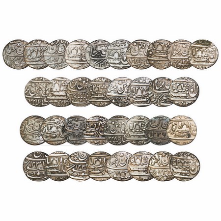 Awadh, Silver (17 Coins), Saadat Ali (AH 1213-1230, 1798-1814AD), Muhammadabad Banaras Mint, in the name of Shah Alam II, AH 1204/26, 1207/26, 1214/26, 1215/26, 1220/26, 1221/26, 1222/26, 1223/26, 1224/26, 1226/26, 1227/26, 1228/26, 1229/26, 1231/26, 1232/26, 1233/26, 1234/26 RY, Fish, flag and star as a mint mark. KM 103.2. Very Fine to Extremely Fine, Scarce.