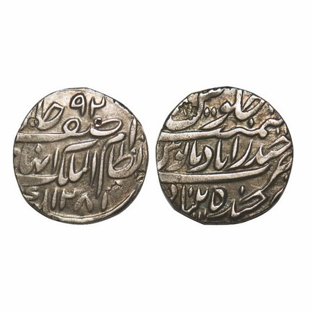 Hyderabad, Silver Rupee, 11.15g, Nasir ad Daula (AH 1244-1273 / 1829-1857 AD), Farkhanda Buniyad Hyderabad Mint, AH 1249, in the name of Muhammad Akbar II, with Crescent and Noon on obverse, . KM C 66.3. Very Fine, Scarce.