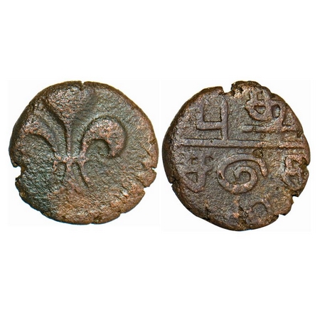 Indo French, Bronze Doudou, 3.46g, (1720-1835 AD), Obv: Fluer de lis, Rev: Tamil legend Pudutcheri. KM 35. About Very Fine, Scarce.