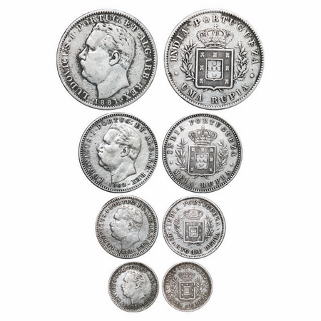 Indo Pourtuguese, Silver (4 Coins), D Luis (1861-1889 AD), 1 Rupee 1881, ½ Rupee 1882, ¼ Rupee 1881, 1/8 Rupee 1881, as a set , Goa issue, A.Gomes (page 602), 14.01, 13.02, 12.01, 11.01, KM 9, 10, 11, 12. About Very Fine, Very Scarce.