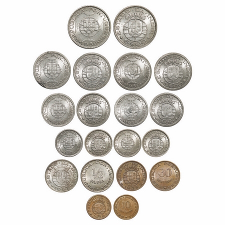 Indo Pourtuguese, (10 Coins), Republic, Copper Nickel 1/2 Rupee 1947 (1), Copper Nickel 60 Centavos 1958 (1) & 1959 (1), Copper Nickel 1 Escudo 1958 (1) & 1959 (1), Copper Nickel 3 Escudo 1958 (1), & 1959 (1), Copper Nickel 6 Escudos 1959 (1). Brilliant Uncirculated to Uncirculated, Scarce, and Bronze 30 Centavos 1958, & 10 Centavos 1959. A.Gomes (page 605, 606) 08.01, 15.01, 15.02, 16.01, 16.02, 17.01, 17.02, 18.01, 14.01, 13.02. KM 35, 34 33, 32, 31, 30. About Uncirculated. Very Scarce.
