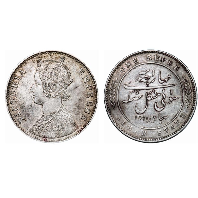 Alwar, Silver Rupee, 11.60g, Mangal Singh, AD 1891, Calcutta Mint, Portrait of Victoria Empress, branch without twig. Milled coinage. KM 46. Very Fine, Scarce.