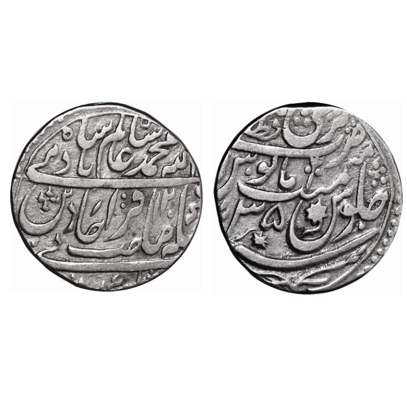 Awadh, Silver Rupee, 11.05g, Asaf ud Daula (AH 1188-1212 / 1775-1797 AD), Najibabad Mint, AH (12)09/35 RY, INO Shah Alam II, Crescent on obverse & Fish & star reverse. MKDM 4.177 type. About Extremely Fine. Very Scarce.