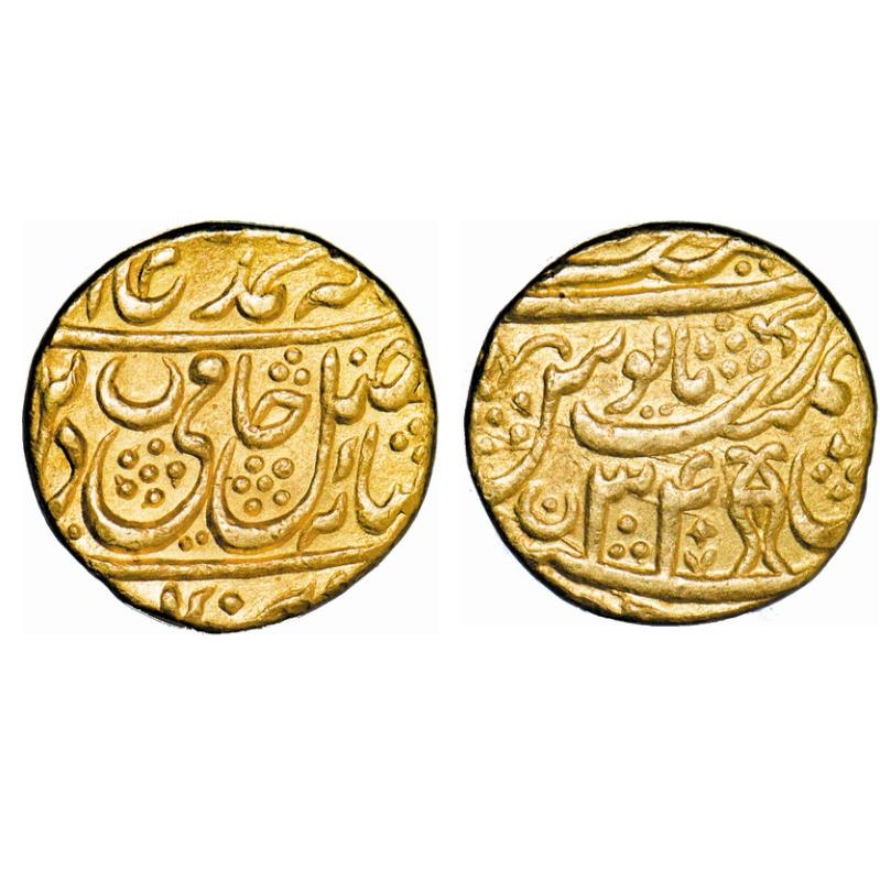 Awadh, Gold Mohur, 10.76g, Saadat Ali Khan (AH 1134-1151 / 1722-1739 AD), INO Muhammad Shah, Muhammadabad Banaras Mint, AH 11xx/20 RY. MKDM 1.51 type date Unlisted. Very Fine, Rare.