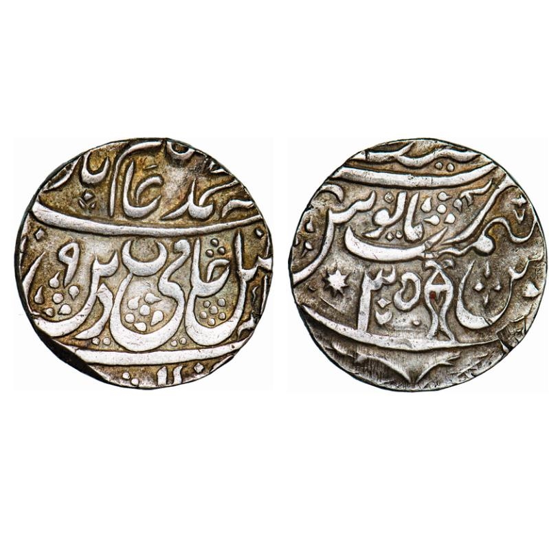 Awadh, Silver Rupee, 11.05g, Asaf ud Daula (AH 1188-1212 / 1775-1797 AD), Najibabad Mint, AH (12)09/35 RY, INO Shah Alam II, Crescent on obverse & Fish & star reverse. MKDM 4.177 type. About Extremely Fine. Very Scarce.