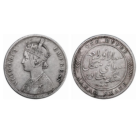 Alwar, Silver Rupee, 11.44g, Mangal Singh, AD 1880, Calcutta Mint, Portrait of Victoria Empress, Milled coinage. KM 45. About Very Fine, Scarce.