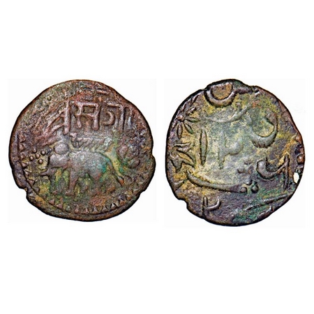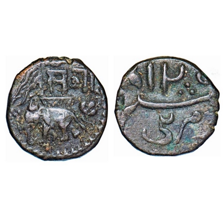 Baroda, Copper Paisa, 7.39g, Sayaji Rao II (AH 1235-1264/1819-1847 AD), Amreli Mint, AH (1256), Elephant & flag to left, Flower and nagari 'Sa Ga', with dotted borders on obverse. KM C 29.3. About Very Fine, Rare.