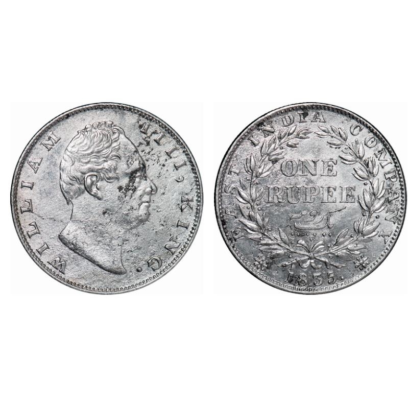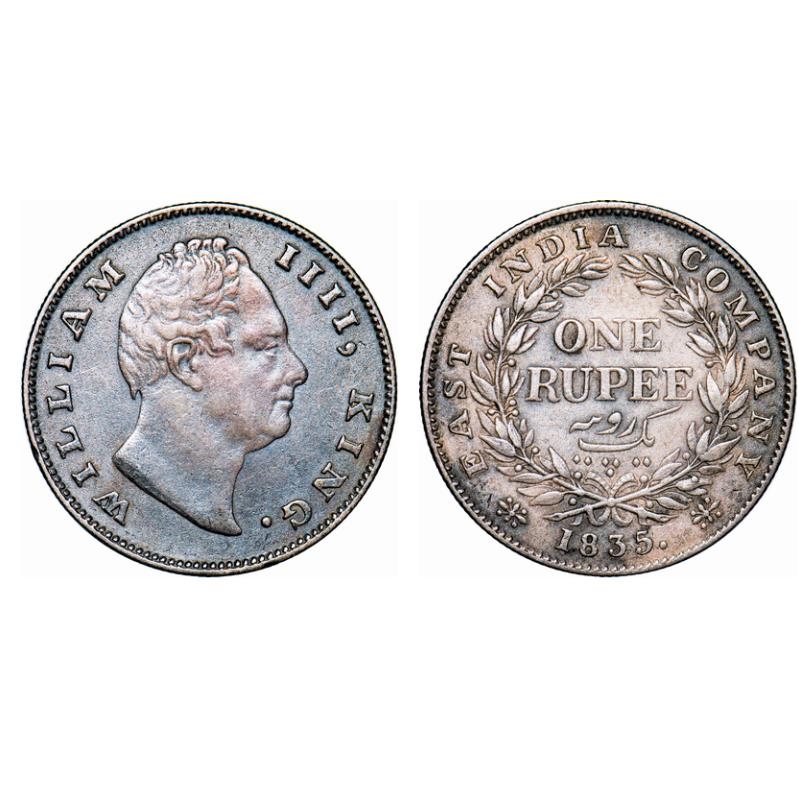 William IV, Silver, Rupee, 1835, Calcutta Mint, A/II, 'F' incused, Dot after F, With raised dot after year, Large and thick letters of the legend with bud leaves above 'E' of One, Wreath with 19 Berries (10L + 9R), Leaf tip in the wreath falls short of base of 'T' in East. GK 8. Very Fine. Scarce.