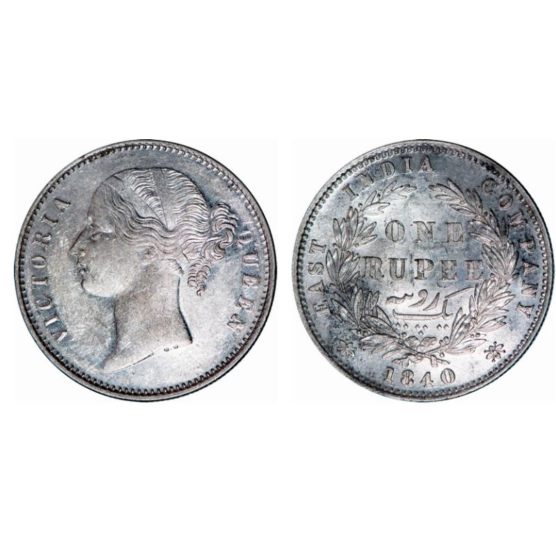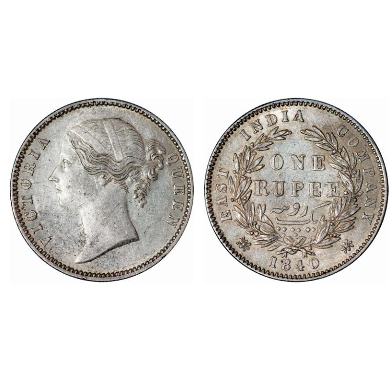 Victoria Queen, Silver, Rupee, 1840, CL, Calcutta Mint, A/I, English Head, With bud leaves above 'O' and 'E' of One, Wreath with 19 Berries (10L + 9R). GK 80. NGS Slabbed XF 40. Scarce.