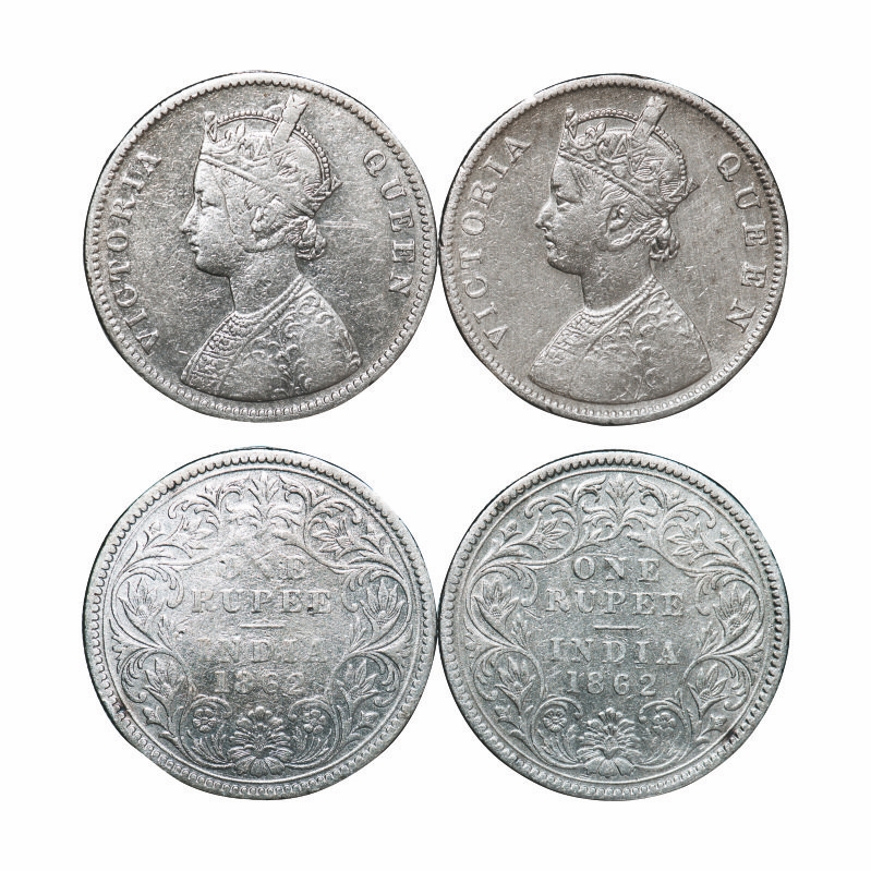 Victoria Queen, Silver, Rupee, (2 coins), 1862, Calcutta Mint, 1) B/III, Embroidery in high relief, 2) A/III, w/o initial 'J'. GK 243, 254. Very Fine to Very Fine+. Scarce.