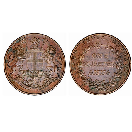 William IV, Copper, Quarter Anna, 1835, Madras Mint, A/II, Large numerals of year, The numeral 1 of the year has oblique top serif, Wreath with 18 Berries (9L + 9R), 'Y' in Company opposite a Berrry, Wreath tips ends with 3 leaves, Reverse aligned. GK 73. Extremely Fine. Scarce.