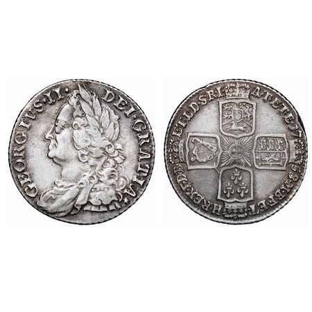 Great Britian, Silver (0.9250 Silver) Lima Shilling, 5.98g, George II, 1745. Obv: Bust to left and Lima below, Rev: shield. Struck from Spanish silver seized at Lime, Peru. KM 583.2. About Very Fine, Very Rare.