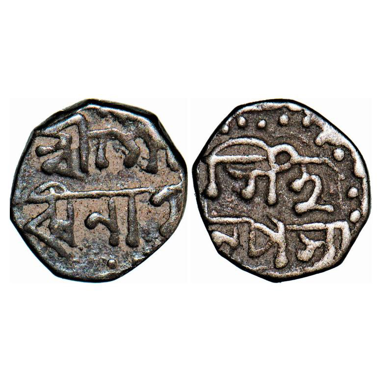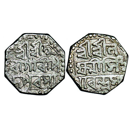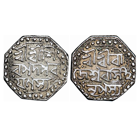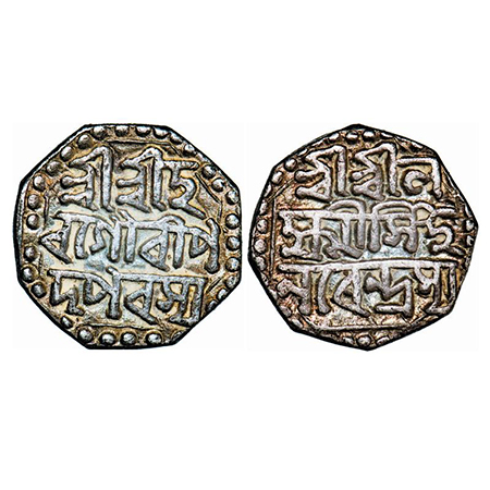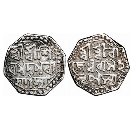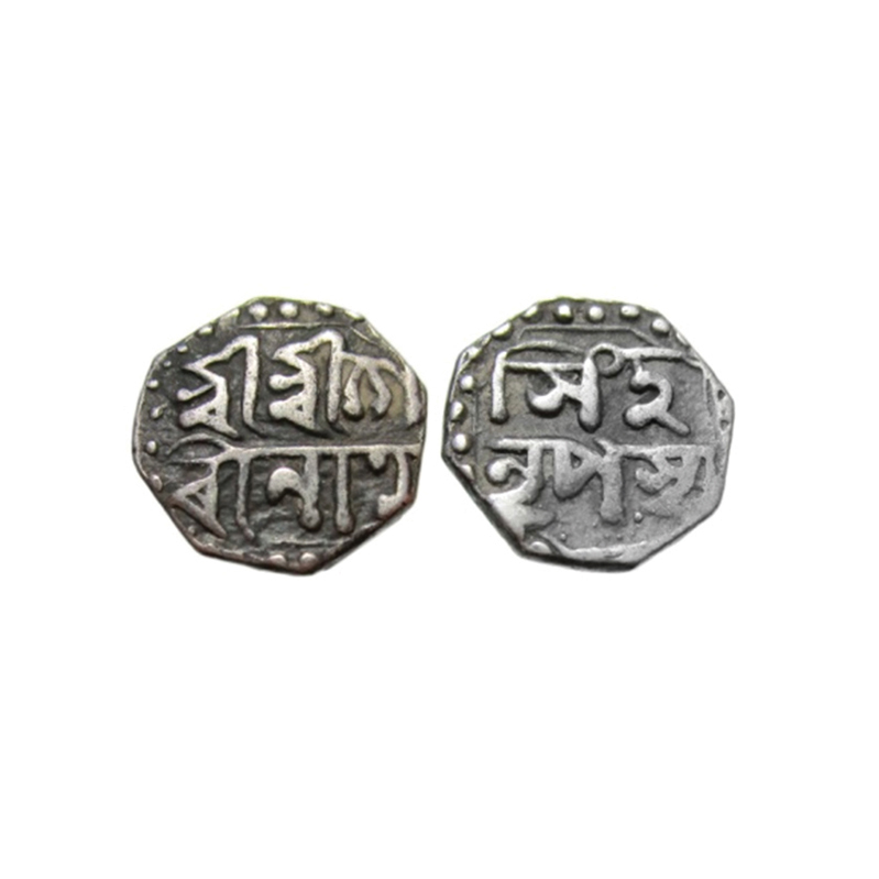 Assam, Octagonal Silver 1/16 Rupee, 0.60g, Gaurinatha Simha (1780-95), undated, Assamese legends in two lines, Obv: Sri Sri Gau/rinatha, Rev: Simha/ Nrpasya. Reverse die perfectly struck at 6 o'clock. (A.Mitra 433 types. RB. R128.1 types). Very Fine+, Very Scarce.