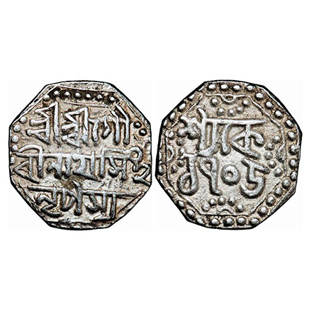 Assam, Octagonal Silver Quarter Rupee, 2.78g, Gaurinatha Simha (1780-95), Sk. 1705, Assamese legends in three lines, Obv: Sri Sri Gau/rinatha Simha/ Nrpasya, Rev: in two lines, Sake 1705, Reverse die perfectly struck at 6 o'clock. (A.Mitra. 403. RB. R93.1). Broad flan, Extremely Fine, Scarce.