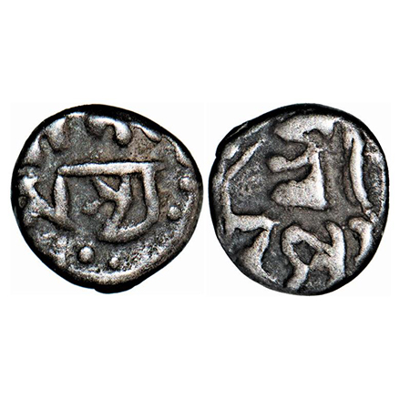 Assam, Silver 1/16 Rupee, 0.55g (low weight), Gaurinath Simha, Obv: Sri Gau / rinatha. Rev: Simha / Nripasya. A.Mitra 432 type. Very Fine, Scarce.