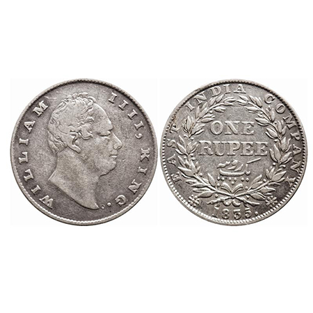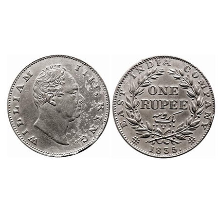 William IV, Silver, Rupee, 1835, Bombay Mint, B/II(ii), No initials, Rev aligned, Medium thin size letters of the legend, Bud leaves above 'E' of One, Wreath with 20 Berries (11L + 9R), 2 nicks on rim edge. GK 33. Very Fine. Scarce.