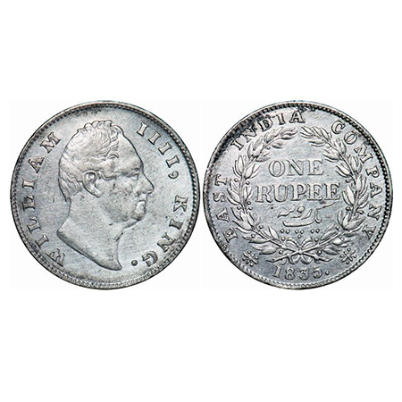 William IV, Silver, Rupee, 1835, Calcutta Mint, A/III, Dugout f, Rev aligned. GK 27. Very Fine+. Scarce.