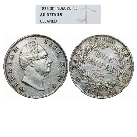 William IV, Silver, Rupee, 1835, Bombay Mint, B/II(ii), No initial, Rev aligned, Medium thin size letters of the legend, with bud leaves above 'E' of One, Wreath with 20 Berries (11L + 9R), 1 o'clock on Rev. GK 33. NGC Slabbed AU Details, Cleaned. Scarce.