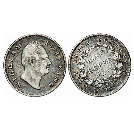 William IV, Silver, Half Rupee, 1835, Bombay Mint, A/I(ii), No initials, Two leaves above 'F' of Half away from branch. GK 50. Very Fine. Scarce.