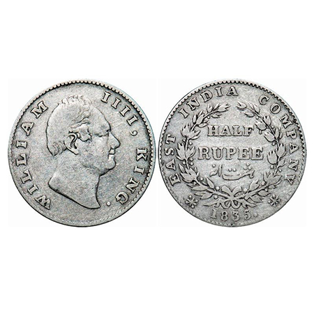William IV, Silver, Half Rupee, 1835, Calcutta Mint, A/II, 'F' incused, Large and thick size letters of the legend, Wreath with 19 Berries (9L + 10R), Two leaves above 'F' of Half. GK 43. Fine+. Scarce.