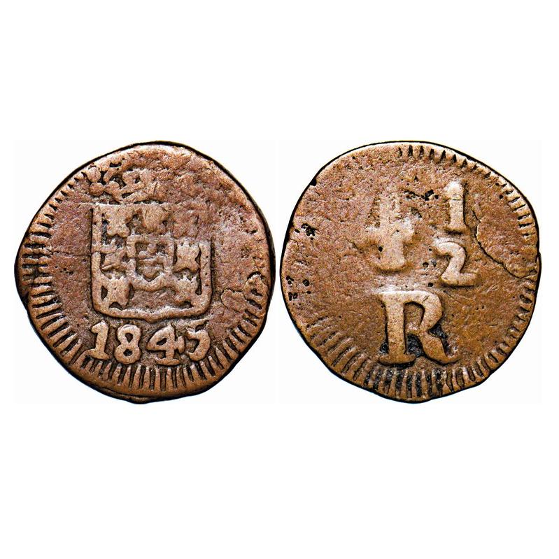 Indo Portuguese, Copper 4 ½ Reis, 2.63g, D. Maria II (1834-1853 AD), 1845 AD, Goa issue. A.Gomes (page 595) 04.02 / KM 258. About Very Fine, Scarce.