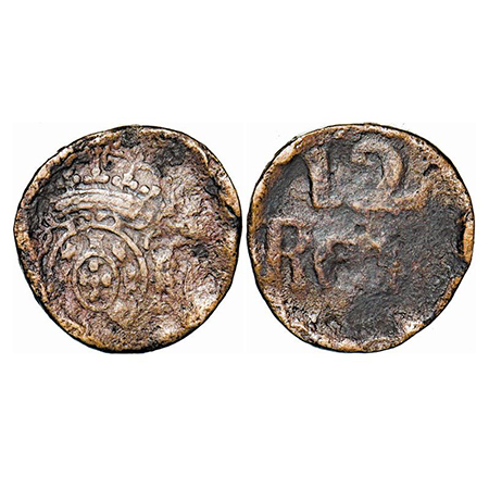 Indo Portuguese, Copper 6 Reis, 4.11g, D.Maria I (1788-1799 AD), Diu issue, N/D, Obv: Crowned Arms between garland, Rev: 6 Reis. A.Gomes (page 583) 14.01 / KM 168 type. Fine+, Scarce.