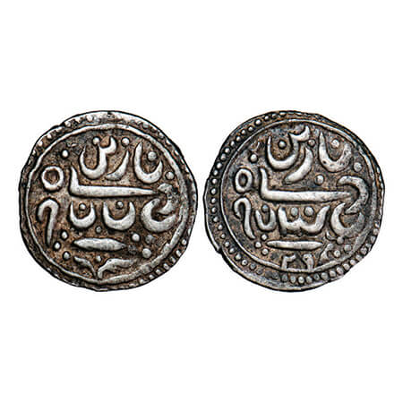 Cooch Behar, Silver Rupee, 10.47g, Nara Narayan (1555/1587 AD), SE 1477 (inverted 4). Bengali assamese Script. Obv: Sri sri / Siva Charana / Kamala Madhu / Karasya. Rev: Sri Sri / Mannaranara / yana Bhupala / sya Sake / 1477. Bose A1. Very Fine, Scarce.Cooch Behar, Silver Rupee, 10.34gm, Nara Narayan, SE 1477, Nagari legend type with,'Shi', 'Ra', 'Na' of Shiva charana in nagari legend. Rhodes/Bose 3. Very Fine, Scarce