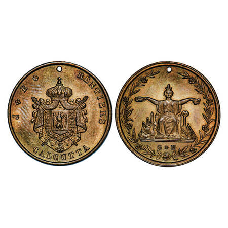 Private (Tea) Token, Brass, 3.27g, J & B RENTIERS CALCUTTA, Monograms on both sides, G & H, pireced hole. Unlisted, Uncirculated, Rare.