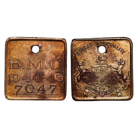 BOMBAY MUNICIPALITY TOKEN, Brass, 7.12g, Obv: Coat of Arms of Bombay, Rev: B.M.C. 1944-45, 7047. Very Fine, Very Scarce.