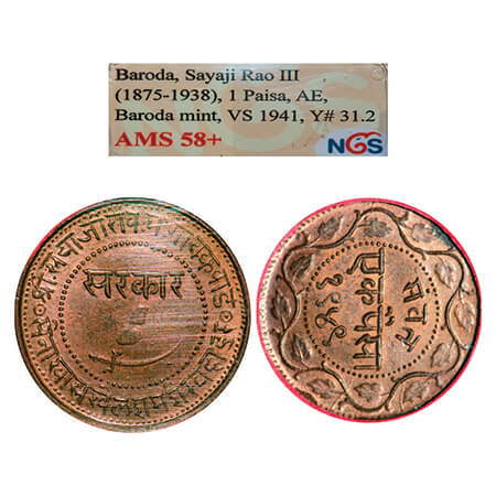 Baroda, Copper Paisa, Sayaji Rao III, VS 1949, reverse 3 o'clock die axis. KM 31.2a. NGS Slabbed AMS 58+, Scarce.
