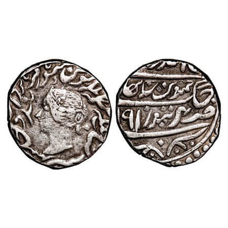 Bharatpur, Silver Rupee, 11.07g, Jaswant Singh (AH 1269-1311 / 1853-1893 AD), Bharatpur Mint, (VS 1910/ 1858 AD), without katar type, VS 1910, AD date unseen, INO Queen Victoria. KM 157. Very Fine+, Rare.