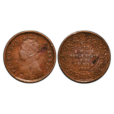 Dewas Junior Branch, Copper 1/12 Anna, 2.36g, Narayan Rao (1864-1892 AD), 1888 AD, bust of Victoria Empress on obv. KM 11. About Very Fine, Rare.