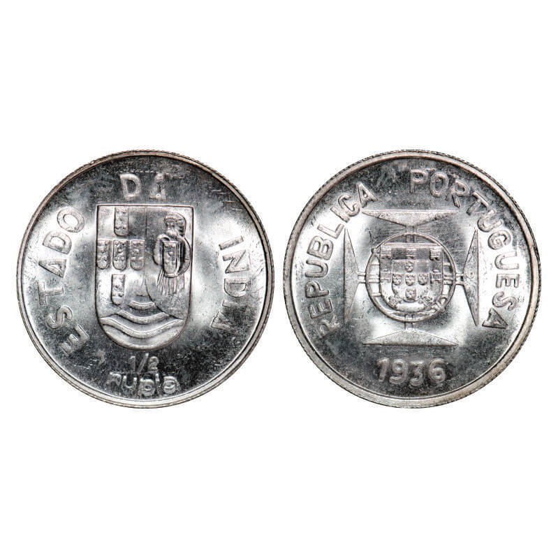 Indo Portuguese, Silver ½ Rupee, 6.00g, Republic (1910-1961 AD), 1936 AD. A.Gomes (page 605) 7.01 / KM 23. Brilliant Uncirculated, Scarce.
