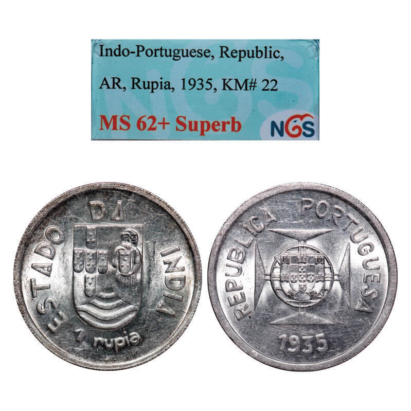 Indo Portuguese, Silver Rupia, Republic (1910-1961 AD), 1935 AD. A.Gomes (page 606) 10.01 / KM 22. NGS slabbed MS 62+ Superb, Scarce.