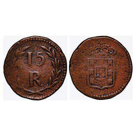 Indo Portuguese, Copper, 15 Reis, 7.29g, D.Maria II (1834-1853 AD), undated type. A.Gomes (page 595) 11.01 / KM 263. About Very Fine, Scarce.