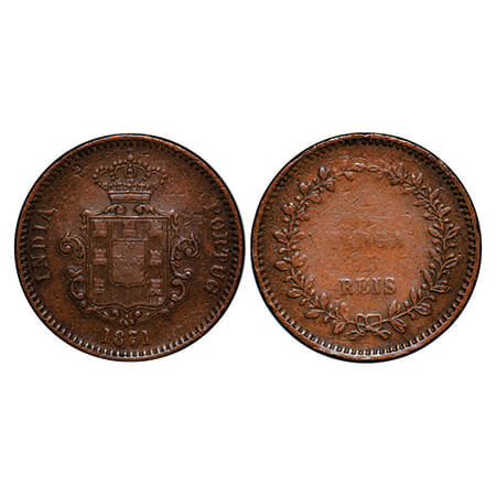 Indo Pourtuguese, Copper, ¼ Tanga, 9.38g, D. Luis (1861-1889 AD), 1871 AD, Goa issue, Coat of arms and date on obverse, denomination on reverse, A.Gomes (page 602) 06.01 / KM 304. Fine+, Scarce.
