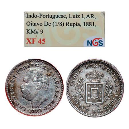 Indo Portuguese, Silver 1/8 Rupee, D. Luis, 1881 AD. A.Gomes (page 602) 11.01 / KM 309. NGS slabbed XF 45, Scarce.