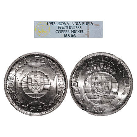 Indo Portuguese, Copper Nickle Rupia, Republic, 1952. A.Gomes (page 605) 12.01 / KM 29. NGC slabbed MS 66, Very Scarce.