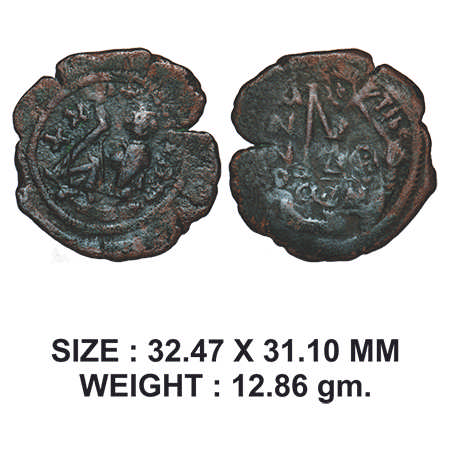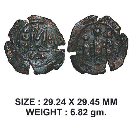 ARAB-BYZANTINE: Two Standing Figures, ca. 680-700, Copper, 12.86g, Tabariya, capital M, anchor above, diamond symbol below, with mint name in Greek & Arabic around , double struck in both sides. About Very Fine, Scarce.