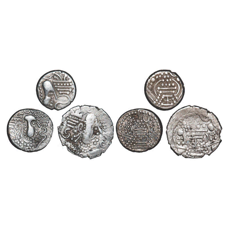 Chalukyas of Gujarat, Anonymous Issue, Gadhaiya paisa type, Billon Drachma (3 coins), Obv: Stylized crowned bust of ruler facing to right, Rev: Fire altar. J. Deyell # 158b. About Very Fine, Scarce.