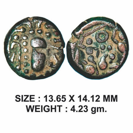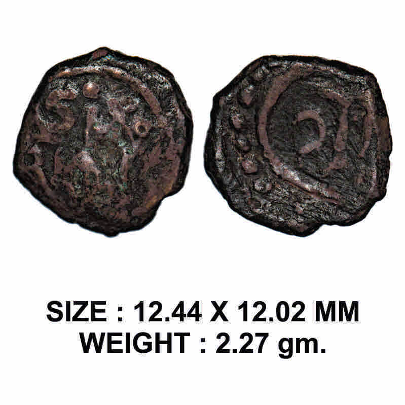 Medieval Gujarat, Anonymous Issue, Copper Unit, 1.35g, Obv: A face of Yaksha, Rev: Part of design. About Very Fine, Scarce.