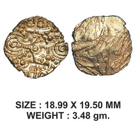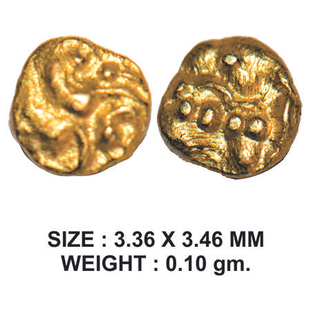 Telugu Chodas of Nellore, Bhujabala, Gold Pagoda, 3.52g, punch-marked type with two symbols clearly visible, a punch with legend and a crude symbol in a shallow punch. Mitch K&A 313. Very Fine, Scarce.