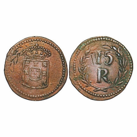 Indo Portuguese, Copper, 15 Reis, 9.54g, D.Maria II (1834-1853 AD), undated type, Error double struck. A.Gomes (page 595) 11.01 / KM 263. About Very Fine, Rare.