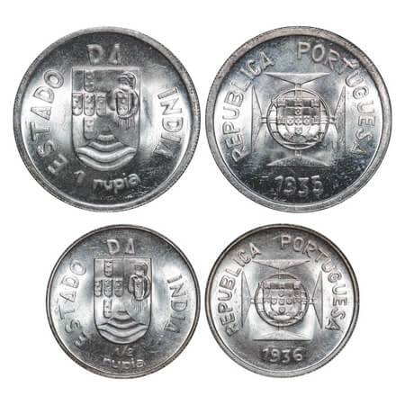Indo Portuguese, Silver Rupee & ½ (2 coins), Republic (1910-1961 AD), 1935, 1936 AD. A.Gomes (page 605, 606) 07.01, 10.01 / KM 22, 23. Uncirculated, Scarce.
